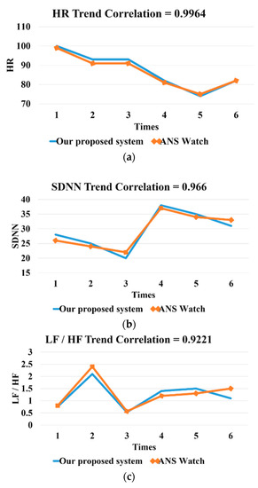 For the PPG comparison, we used a commercial product called ANSwatch (Model TS-0411) [22] as our benchmark. We compared three metrics, including heart rate, heart rate variability (SDNN), and LF/HF, obtained from ANSwatch and our PPG sensor device. We found a strong correlation (above 90%) between ANSwatch and our device, based on one of the subjects, as shown in Figure 8.