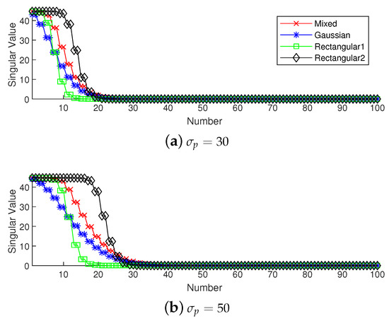 It is found that the shapes of singular values in descending order shown in Figure 1 are similar to the shapes of their weight. The singular values of the original sensing matrix are all the same and equal to , and the singular values of rectangular type scan be clearly divided into two parts: the values of the smaller part are all near zero, and those of the larger part have the same value as —they are of Gaussian type and have a similar shape to the folded normal distribution, with most of them being near to zero. In general, the weighted sensing matrix is near low-rank when the weight is concentrated.