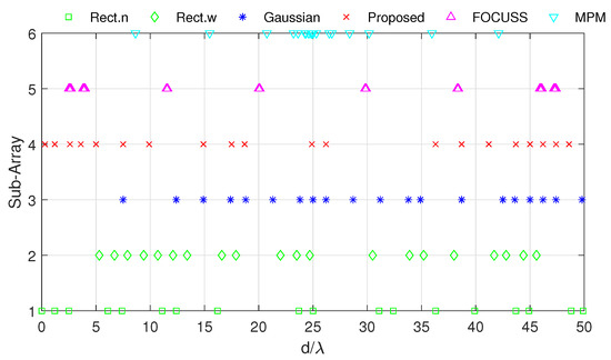 Figure 15 shows the DOA estimation error in terms of OSPA distance with a variance of prior distribution given by and when the true distributions are the same. The coherence curves and element positions of the corresponding subarrays in this simulation are shown in Figure 16 and Figure 17.