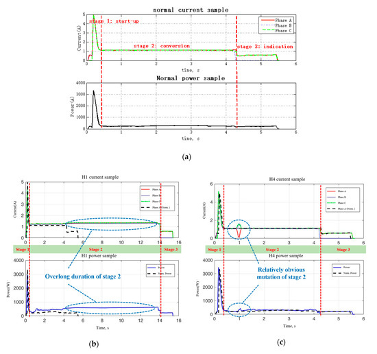The detailed analysis of monitoring data of the turnout system under normal and abnormal working conditions is as shown in Figure 3. Figure 3a is the normal current and power sample, showing the three stages of a single movement of the turnout, i.e., startup (Stage 1), conversion (Stage 2) and indication (Stage 3).