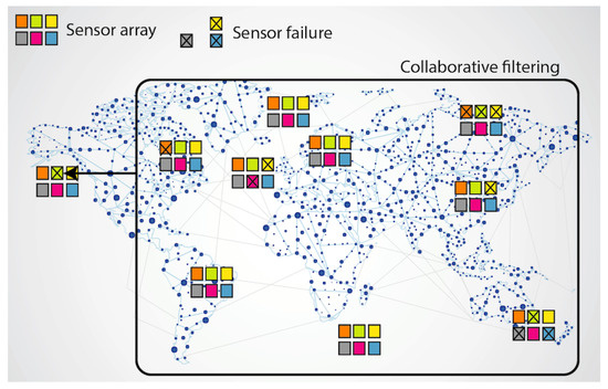 The key idea of our proposal is that, fortunately, sensor array results are not completely independent from each other; e.g., readings from sensors under high environmental temperature in some area in China can help to predict readings of some other sensors that have reported failures in a high temperature area from Nevada; it can be done when a correlation in the sensor values of both areas occurs. This is precisely what CF RS are trained for: they predict item’s values that the users have not voted yet based on the rating values of the rest of the RS users. The analogy with the IoT scenario occurs when sensors play the role of RS items, and each instant of time in which the sensor array was measure plays the role of an RS user. In this case, we can predict some missing sensor value from the whole set of measures of the IoT network along time and space, in the same way that we predict some item value from the whole set of ratings in the RS. Figure 1 shows the explained concept: when sensor arrays are deployed in large IoT networks, each failed sensor value can be predicted from the whole set of sensor array values in the system.