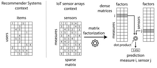 The right side of Figure 2 explains the MF operation. It creates two dense matrices of a reduced common dimension (the hidden factors): the number of factors is less than the number of sensors and much less than the number of sensor measures in the IoT network. Once the iterative MF algorithm has learned the factors, we can predict the value of a failed sensor j in an instant of time i by making the dot product of their factors. It is important to realize that hidden factors capture the essence of the sparse matrix values, and consequently predictions are made based on the whole set of reading values in the IoT sparse matrix. As an example: the value of a sensor failed due to excessive UV radiation can be predicted from the values of a set of similar not failed sensors under similar extreme situations at other moment of time.