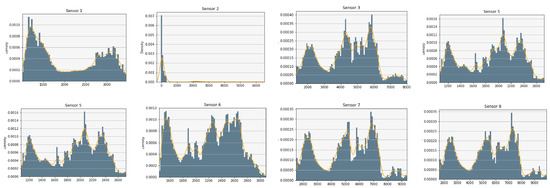 In order to glace over the data, the measures have been plotted to analyze their distributions. As an example, Figure 3 shows the result for sensors 1 to 8 of the first dataset [39] (before normalization). A relevant issue is the sensors’ range of values, since it is convenient that a subset of them have similar normalized values, such as we can observe in Figure 4. For computational reasons, we have used a subset of [39], containing 84,165 random samples of time measures from the original data (1,346,640 sensor measures in total). The second dataset [40] was completely used with a total of 13,910 time measures (1,780,480 sensor measures in total).