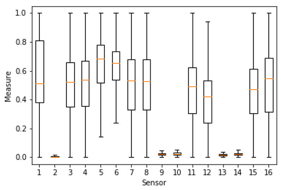 Boxplot of the normalized range of values for the 16 sensors in the [39] dataset. x-axis: sensor id, y-axis: range of results.