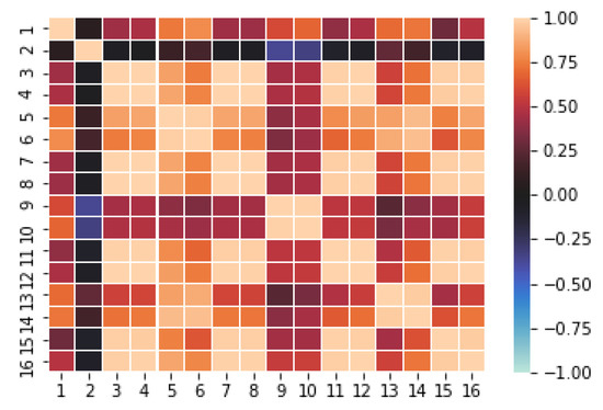 Correlation matrix for the 16 sensors in the [39] dataset. Warm colors (with maximum light orange) stand for strong positive correlation and cool colors (with maximum light blue) mean strong negative correlation. Black indicates no linear correlation.