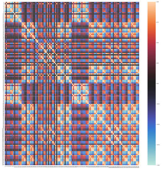 The CF MF model discovers the complex relations existing among feature values and stores them into the hidden factors resulting from the dimensionality reduction process. For the MF to work properly it is necessary that there exists quite strong underlying relations between features. CF datasets contain a variety of correlations, since each user has a set of “semantic neighbors” that share preferences on items; analogously, each item has a set of similar items that have been voted in a similar way. However, at a first sight, it is not clear that in our sensor array datasets each sensor measures correlate with the ones of some other sensors. Since this is a key issue to fulfill the paper’s hypothesis, we have obtained the correlation matrices for both the [39] dataset (Figure 5) and the [40] dataset (Figure 6). Recall that, given two random variables X and Y (say, the time series of two sensor readings), the correlation between X and Y, , is given by