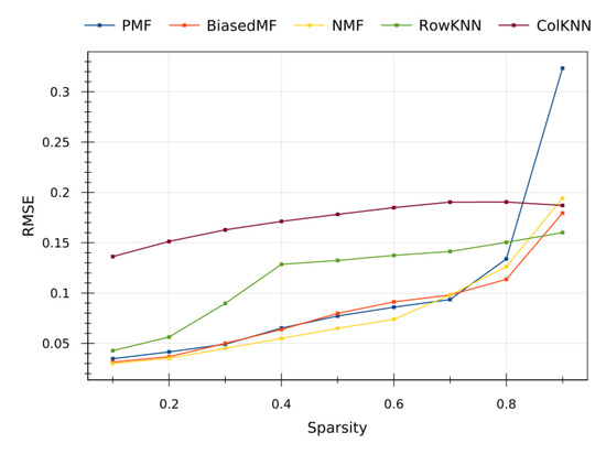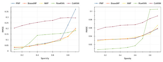 From both plots in Figure 7 we can observe that, as expected, the higher the level of sparsity the higher the error, since the CF methods have less information to make predictions. Model-based methods (PMF, BiasedMF and NMF) return similar quality values, except PMF that is more sensitive to data sparsity. The quality results of PMF collapse in the smallest dataset [39] (blue line at the left side in Figure 7) when high sparsity values (0.8 and 0.9) are tested. The memory-based RowKNN method provides the best results in the larger dataset [40] (right side of Figure 7) for small sparsity, but it does not adequately predict on high sparsity scenarios. This is consistent with the CF literature [26,28]. The ColKNN method turns out to be not competitive in any case, with high (but almost constant) error for all the sparsity levels.