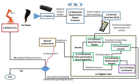Figure 14) and achieve automated grinding using a force of 50N. In order ensure an optimal grinding regime, we make use of a combination of a Markovian-based surface region processor algorithm and particle generator. The particle generator enabled us to produce a digitized version of the fan-blade’s surface (
