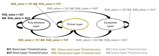 Furthermore, surface tomography approaches that used probes to determine surface depth were found to be slow and limited in their scanning size. Hyper-spectral cameras were investigated. However, the reflectivity and curvature of the blade coupled with lighting conditions made material depth measurement difficult. As a result, our focused shifted to tracking the state of material removal through the transition of the material color properties. Both the top polyurethane (black) and middle epoxy primer (white or yellow) have different color properties, making it possible to track the rate of material removal though the use of an RGB-D camera.