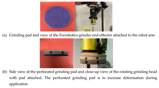 25], a robotic arm is used to generate and optimize a tool path so that the contact points between the tool tip and the workpiece are evenly distributed along the grinding path. Furthermore, in their work, the contact force’s direction and amplitude is measured with a force prediction algorithm and controlled with a force-position controller. As can be seen in all the work reviewed above, effective automation of a surface treatment process such as grinding requires a capturing and understanding of the manual process as well as the grinding forces at play at the interface of the rotating grinder and the surface [