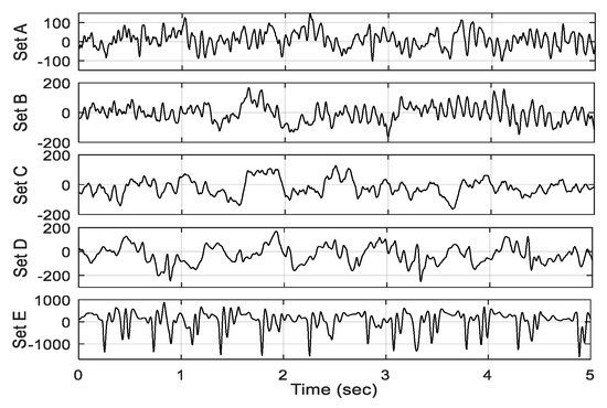 All EEG signals were recorded using the same 128-channel amplifier system with an average common reference. The data were discretized at a sampling rate of 173.61 Hz and 12-bit analog-to-digital conversion. A band-pass filter with frequency range 0.53–40 Hz was used to preprocess the data. As examples, EEG frames of 5 s length selected from each of the five sets (sets A–E) are illustrated in Figure 1.