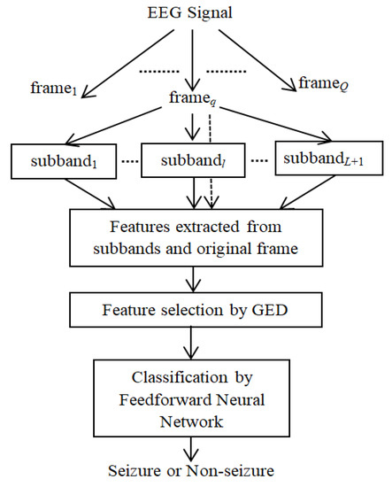 Each of the five sets of EEG data has 100 segments of 23.6 s length. The framing of each EEG segment is performed with an overlapping of reasonable portion. On the basis of the requirement of the medical application, the size of the frame is set at 10 s with 50% overlapping. The EEG frame of 10 s length is decomposed into subband signals using DWT. The desired features are extracted from each subband as well as each EEG frame. All the features (obtained from subbands and EEG frames) are combined to derive the raw feature vector corresponding to each frame. The proper selection of dominant features enhances classification accuracy in the machine learning paradigm. A GED-based method is implemented to select the potential feature subset. It suppresses the redundant features that have no significant role in epilepsy classification. Thus, the significant features of the training dataset obtained are used to train the FfNN classifier. Then, the performance is evaluated by the test dataset. The following subsections describe the steps of the proposed seizure-detection method.