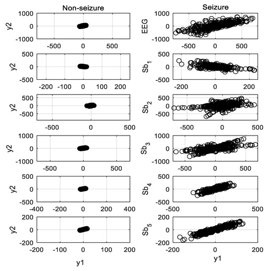 Figure 4 shows the SODP of seizure and nonseizure EEG signals and their five subbands illustrated in Figure 3. The area of the ellipse covering the SODP is calculated for the plots. The epileptic EEG has a higher number of transient events, and hence provides a bigger elliptical structure than the seizure-free signal. The 95% confidence area is used to determine the ellipse area occupied by the data points of the subband signal [24,32]. The ellipse area Ae of SODP with 95% confidence is defined as [7]