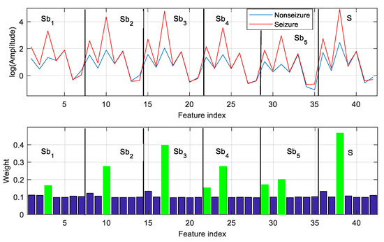 The GED-based feature-selection approach assigns a weight to each feature, and the features are ranked based on their weight. Considering the classification task of nonseizure (set A) and seizure (set E), feature selection with GED is applied to the feature vectors extracted from all labeled EEG frames of A and E. The weight vector derived by GED is used to rank the features. Then, the top-ranked features are used for classification. The weight vector used to rank the features in the case of A–E classification is illustrated in the bottom panel of Figure 5. For instance, the weights of the top-ranked 8 features out of 42 are marked in green (bottom panel of Figure 5). It is observed that the feature with higher weight has significant interclass distances (represented by amplitude). The other features make a less significant contribution to A–E classification.