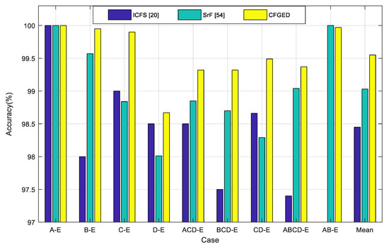 The proposed method achieves the highest average accuracy over nine different evaluation cases. Notably, the maximum number binary classification cases are considered in this study. The highest classification accuracy of 100% is achieved with CFGED in case 1 (A–E), case 2 (B–E), and case 9 (AB–E). The lowest accuracy is 98.60% in case 4 (D–E), which is still 0.10% greater than that of ICFS [20] (98.50%). The accuracies for case 4 (D–E) of all other methods mentioned in Table 4 are lower than the accuracy achieved by ICFS [20].