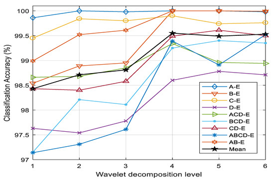 The number of subbands obtained by applying DWT to EEG is a significant factor of classification performance. It depends in turn on the level of wavelet decomposition. The classification accuracies of nine cases with different levels of wavelet decomposition are illustrated in Figure 7. It is evident that the highest average classification accuracy is accomplished with four levels. In most of the cases, the accuracy increases up to the fourth level and remains almost constant at levels greater than four. The subbands obtained by a wavelet decomposition level higher than four have a negligible impact on the performance of EEG classification into seizure and nonseizure signals. The higher-order subbands contain lower-frequency components, which do not carry sufficient variance to detect seizure events in EEG signals. Considering the performance issue, four-level wavelet decomposition (five subbands) is implemented in this study.