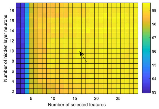 Average performance over nine cases as a function of the number of selected features (using GED) and number of neurons used in the hidden layer of FfNN. The maximum average accuracy is achieved with 18 selected features and 10 hidden neurons.