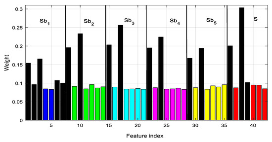 A discriminative subset of features extracted from EEG is more suitable to correctly classifying the seizure event, whereas the others must be removed to reduce performance degradation. The selection of the subset of appropriate features also requires the removal of the irrelevant or redundant elements in the feature vector. It also reduces overfitting of training time in machine learning. A GED-based supervised feature-selection method is implemented here. The weights assigned by GED to each of 42 features of an EEG epoch of case 4 (D–E) are shown in Figure 9. It is observed that the 38th feature has the maximum weight, and hence is the top-ranked feature. The feature vector is sorted based on the weight assigned to each one. The top-ranked 16 features are selected (from the sorted feature vector) to be used in seizure detection. Another interesting phenomenon is the effectiveness of using subband features. The 16 features are selected from different subbands rather than from the original EEG. Each subband produces seven features. Five, two, two, two, and two features are selected from subbands Sb1, Sb2, Sb3, Sb4, and Sb5, respectively, and the remaining three from a fullband EEG signal (S). This provides evidence that, without employing the subband features, the seizure-detection performance is likely to be reduced. The subband features represent discriminative components localized in narrowband signals.