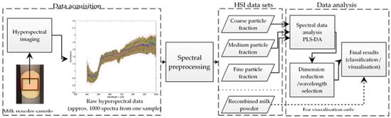 The hypercube obtained after data acquisition needs appropriate multivariate data analysis tools that can relate the hyperspectral data with milk powder quality attributes. Principal component analysis (PCA), discriminant analysis (DA), and partial least square (PLS) regression are among the common multivariate data analysis tools reported in the literature which can be used to explore the relationship of spectral variation with the chemical/physical/functional properties [,]. Furthermore, suitable data pre-processing techniques such as normalisation, de-noising, smoothing, filtering, and/or taking derivatives of the spectra are required for preparing data sets for subsequent data analysis.
