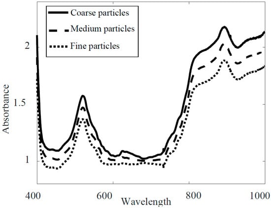 A square region of interest (ROI) with the same spatial resolution was manually selected for all the images. The standard normal variance (SNV) [] was used for spectral data normalisation for each image of the milk powder sample. The HSI data was noisy when plotted as a function of wavelength. The impact of different pre-processing methods on the milk powder spectrum is discussed in a previous study []. Therefore, spectral smoothing was implemented by the Matlab function smoothn developed by Garcia []. This method was preferred for accommodating multi-dimensional data and providing robust smoothing of spectra generated by HSI. Earlier, Munir Wilson [] reported this pre-processing method for HSI data of milk powders of varying quality obtained from different production locations. Average spectra of three discrete particle size fractions after preprocessing are presented in Figure 2, and show clear offset.