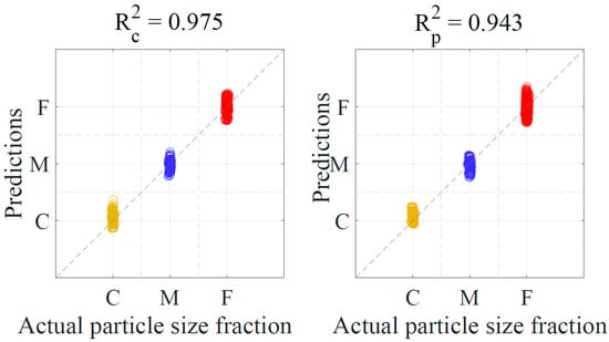 Spectral pre-treatments are usually applied prior to developing the PLS-DA model. Pre-treatments including differentiation, and smoothing were tested before the data analysis, and smoothing showed improvements compared to taking derivatives of the spectra. Therefore, smoothing was applied to all spectra of milk powder samples before the PLS-DA model. An equal number of pixel spectra were selected from the hyperspectral images of the coarse, medium, and fine milk powder samples. Each point on the Figure 4 represents a single spectrum. These spectra and their corresponding class ‘dummy’ variable 1, 2, or 3 (represents C, M, or F, respectively) were involved to build the calibration and prediction model. Spectra whose predicted ‘dummy’ variable was within the range of 0.5–1.5 was classified as coarse particle fraction ‘C’. Similarly, the spectrum of predicted variables of 1.5–2.5, and 2.5–3.5 were classified as medium particle fraction ‘M’ and fine particle fraction ‘F’, respectively. A standard deviation of 0.015, in the form of a Gaussian distributed noise source, was added to the abscissa to show the spread of the data. It was observed that the PLS-DA model can successfully predict the milk powder particle size fractions using the spectral data, as the correlation coefficient values for the calibration and prediction of the PLS model were ≥0.94 (as shown in Figure 4). Classification accuracy, sensitivity, and specificity for selected spectrum from samples of individual particle size fractions have been presented in discussion section. However, it is worth mentioning that all the 27 samples of the validation set of discrete particle size fractions were correctly classified to their respective class C, M, or F.