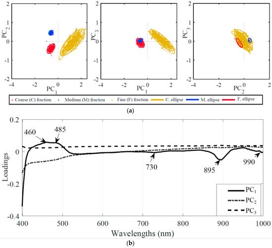 The score and loading plots of the PCA are presented in Figure 5. Different colours were used to represent pixel spectra of the different particle size fractions of milk powder. An ellipse was drawn across each cluster to present the 95% probability of occurrence of the sample within the confined area. The score plots show the three PCs (PC1, PC2, and PC3) that comprised approximately 75% variance of all the spectral data of the three milk powder fractions. Almost 73% variance was associated with PC1 and PC2. The score plots differentiated the three milk powder fractions clearly across PC1 and PC2. The spectral information of various pixels of samples was presented as one single point on the PCA score plot.
