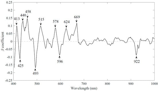 This method was based upon the regression coefficient analysis of the wavelengths obtained from the partial least squares model as shown in Equation (2).