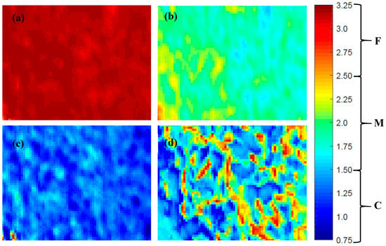Example of prediction map of discrete particle fractions of milk powder (a) fine particle fraction sample; (b) medium particle fraction sample; (c) coarse particle fraction sample; and (d) recombined fractions sample.