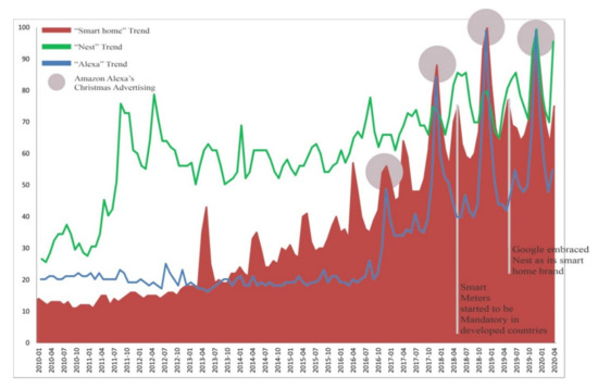 In Figure 1, the comparison also includes the trend of Google Nest. It does not affect the diffusion of smart automation as much as the commercial phenomenon of Alexa, but still, it helps to explain some peaks of penetration. In fact, Nest is another trend in the modern market, being the most popular smart thermostat worldwide. Nest is not just a programmable thermostat—it learns from every user’s preferences, being able to program itself as a consequence. It also learns about the time needed for a specific home to warm up or cool down, managing a proper schedule for every situation. Besides, Nest has a raise awareness aim, inasmuch it shows users when they are in an energy-efficient mode [44]. It can be said that Nest learns from us and we learn from Nest. Giving a brief context, Nest was born as an invention of Tony Fadell and Mark Rogers who, in 2010, founded the Nest Labs. The brand immediately had a discrete success, and Google bought it in 2014 and it became even more popular, helped by other factors such as improvement in wireless broadband technology’s diffusion and the first standards about smart meters’ requirements in offices and homes.