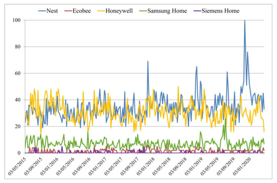 Several other brands deal with the energy topic in home and office automation. Up to now, the main competitor has been Honeywell, connected with Apple Homekit (the famous voice assistant Siri), but recently, also Ecobee, that has a built-in Alexa Voice Service and room sensors capable of detecting occupants [45]. Other famous enterprises like Siemens, Samsung, Xiaomi, KeenHome, etc., are trying to take a piece of this market sector but, as shown in Figure 2, the magnitude of Nest and Honeywell is hard to reach.