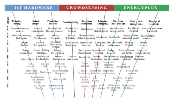 The literature about building energy models is not the object of this review, as its great extension would make this task almost impossible. Only papers that use building simulation as a tool to study the thermal comfort will be analysed and presented, always remaining under the IoT’s sphere of influence. The most common of the simulators have been seen to be EnergyPlus. Unless otherwise noted, the IoT function in these studies is represented by the sensing network layer used to collect data and to validate the models. One of the aims of this section is to investigate how the approach towards people is changing and developing, from a passive role to an active role, preparing the basis toward the people-centric approach of Crowdsensing.