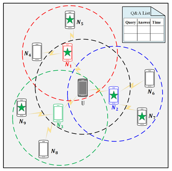 Figure 2 gives a simple running example for the query to neighbors algorithm. In Figure 2, we suppose that there are 10 mobile users who are represented by smartphones, and set the number of hops of neighbors allowed to spread within the P2P network equals to two, i.e., . U represents the user who issues a query to neighboring peers, and represents the neighbors of U. The dotted circle with the same color as the smartphone represents the communication range of this node, and the smartphones with green stars (, , , , ) represent the neighbors who have the corresponding service data U requires.