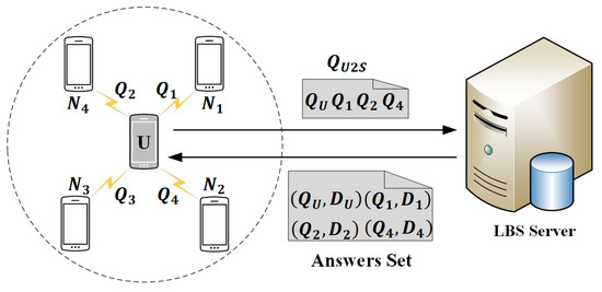 We illustrate our query to the LBS server algorithm based on the example shown in Figure 3. In Figure 3, there are 5 mobile users represented by smartphones. U represents the user who issues a query to the LBS server, and represent the neighbors of U. The dotted circle represents the communication range of U. As shown in Figure 3, suppose , which means that U needs to satisfy 4-diversity for his location information and query interest. Thus, U selects the other 3 dummy queries received from respectively according to proposed query to the LBS server algorithm. Finally, the required message sent to the LBS server by U is . When the LBS server receives , it searches its database and transmits the answers set, which includes the answer to as well as the answer to , back to U.