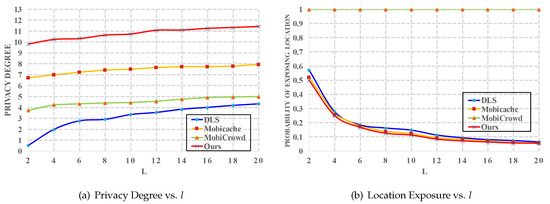 (1) Effects of l on privacy. We use the l-diversity to measure the location privacy for users who send live queries to the LBS server. Actually, the principle of l-diversity and k-anonymity is the same, they both utilize some dummy locations to confuse the LBS server. Moreover, we let and min. As shown in Figure 4a, the privacy degree of DLS [20] is the worst since it does not use the caching. MobiCrowd [22] performs better since it caches the obtained service data to serve others. However, MobiCrowd always submits users’ real locations to the LBS server, and it fails to protect location privacy of the users who have to send live queries. Thus, we can see from Figure 4b that the real locations of users are always exposed and the probability of exposing the real location is 1. We can also find in Figure 4a that our proposed CBPP solution has the highest privacy degree in the four schemes. Although the probability of exposing real location in proposed CBPP solution, DLS and Mobicache [21] are very close in Figure 4b, we protect the location privacy and the query privacy of users simultaneously.