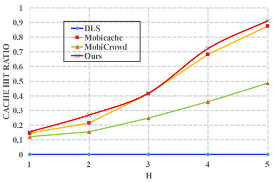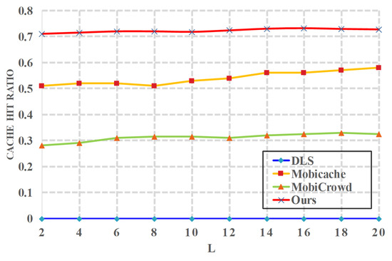 (3) Effects of t on cache. We present how cache hit ratio changes with the simulation time t in Figure 6. In this experiment, we let the number of hops , and let . We can find in Figure 6 that the cache hit ratio of Mobicache [21], MobiCrowd [22] and proposed CBPP solution increases with t since more service data is cached as time goes by. However, the cache hit ratio of DLS [20] is 0. This is because the DLS scheme does not utilize the caching. We can also see that in all schemes, proposed CBPP solution has the highest cache hit ratio.
