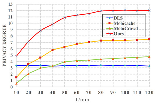 (4) Effects of t on privacy. We evaluate the impact of the simulation time t on privacy degree, which is shown in Figure 7. We also let the number of hops , and let . Generally, the privacy degree in Mobicache [21], MobiCrowd [22] and proposed CBPP solution increases with the simulation time t. The DLS [20] stays an almost fixed value (around 3). Actually, as time goes on, more data is cached and fewer queries are sent to the LBS server, which greatly enhances user privacy. Proposed CBPP solution outperforms all other schemes since it can cache more service data as time goes by.