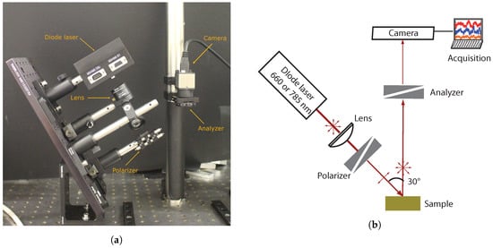 The optical setup used for backscattered speckle measurements is schematically illustrated in Figure 1. Two laser diodes were used in order to stimulate the samples at two wavelengths: one at (Thorlabs HL6545MG) where both absorption and scattering occurred and one at (Thorlabs L785P100) where absorption was negligible [,]. Both laser diodes were mounted with an aspheric lens (Thorlabs C220TME-B for the laser diode and Thorlabs C330TME-B for the laser diode) adjusted to set the laser spot to 5 mm-diameter at the sample surface and optical densities to set the power to at and at .