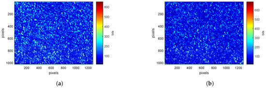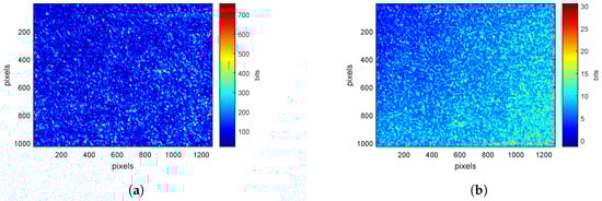 For each ROI on a leaf, speckle patterns are acquired at and , for pp- and ps-polarizations. Figure 2a,b show examples of these patterns at . The average intensity of the image is higher for pp-polarization (Figure 2a) than for ps-polarization (Figure 2b). Indeed, the absorption of electromagnetic radiation at 660 nm is very high (absorption of chlorophyll []). The longer the path in the surveyed medium, the greater the absorption. Image acquired in ps-polarization corresponds to light having traveled inside the sample volume [,], explaining why the average intensity is lower.