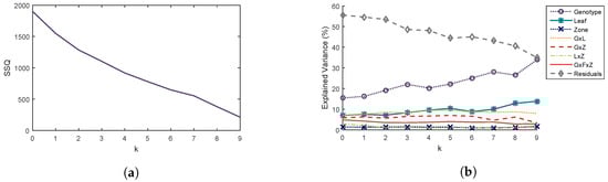Influence of the number k of components taken into account for the orthogonal projection on (a) total variance SSQ of and (b) percentages of variance explained for each factor.