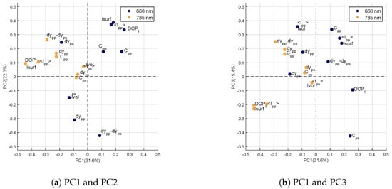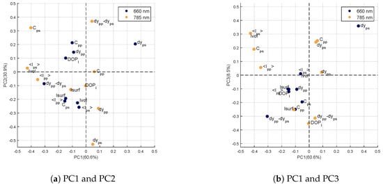 On the first component (Figure 5a,b), the loadings of the variables obtained at are all negative with high values for , and . Whatever the wavelength, and parameters may correspond to unwilling specular reflections due to the fact that the leaf surface is not perfectly flat. The characterizes the portion of light that has kept its polarization state. Specular reflections can increase this parameter as well. The orthogonalization of the dataset to this first component of error would thus reduce the part of specular reflections at which carries little information on the differences between the four genotypes.