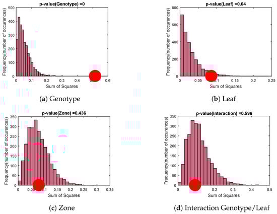 Null hypothesis distributions formed by the assignment permutations are represented by histograms while the variance assigned to the studied factor is identified by the red dot. The genotype factor (Figure 6a) and the leaf factor (Figure 6b) are significant. However, the zone factor and the genotype/leaf interaction factor (Figure 6c,d) are not. This means that whatever the leaf, the genotype has a strong significant impact on the variables obtained by speckle image. We are then likely to be able to differentiate genotypes whatever the leaf chosen.
