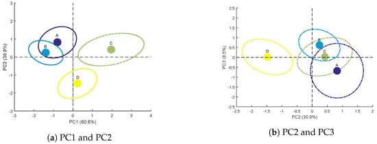 Finally, PC3 (Figure 8b) can be used to distinguish genotype A from genotype B. However, the confidence ellipses of these two genotypes overlap. The discrimination of these two genotypes is therefore not faultless.