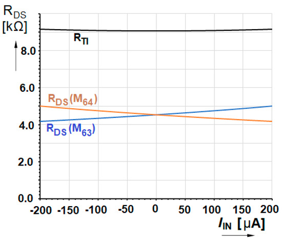 Differential transimpedance as the sum of the linear transistors RDS with their dependences on IIN calculated by Equation (5).