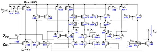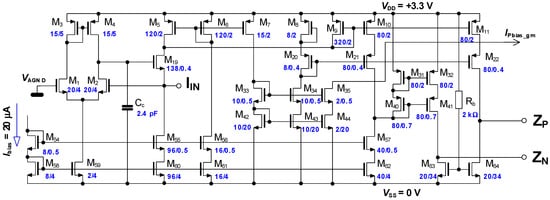The final schematic of the presented input transimpedance stage is shown in Figure 3. The low input IIN impedance is satisfied by operational amplifier consisting of M1–M4, M59 with follower M19, working in the unity feedback. M9 senses the input current change (as the difference of fixed current of bias source M60, while M5 makes some small pre-bias due to linearity) and mirrors it by factor 1/4 to current sources M10, M11. While M11 sources the current directly to transimpedance transistor M64, the second transimpedance transistor M63 is sourced by the complementary current. The output differential voltage VPN is taken between the terminals ZP and ZN. The realized circuit differs only in matters of ESD protection.