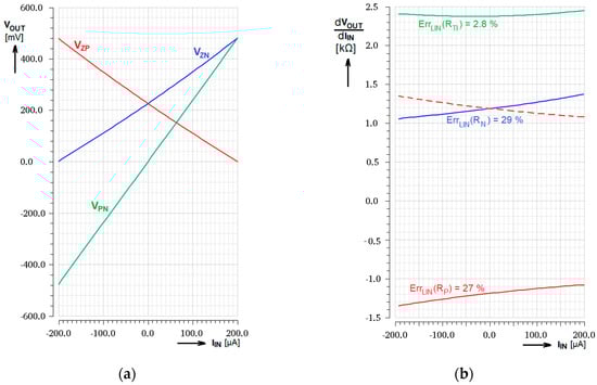 Figure 4a presents the simulated output voltages VZP and VZN together with differential output voltage VPN as the functions of the input current IIN. Derivations of these voltages according to input current, representing the transconductance gain of the whole block, are presented in Figure 4b. The red dashed line represents the transconductance gain of the ZP output branch re-calculated to the differential transconductance gain. Then, it corresponds to Figure 2, considering the factor 4. Due to the differential topology the linearity error is decreased from approx. 28% at one transistor to 2.8% in differential signal.