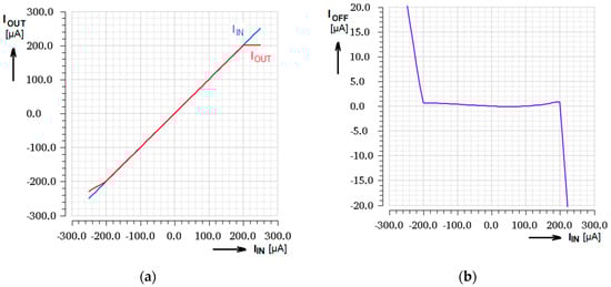 Simulated DC transfer response; (a) Input and output currents for amplifier gain B = 1; (b) Current input offset on input current dependence.
