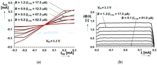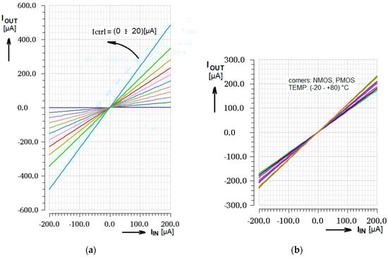 The same response simulated while the gain control current ICTRL is stepped from 0 to 20 µA with step 2 µA, presented in Figure 7a, gives a hint by curves slope that the control of the gain is highly linear up to ICTRL = 12 µA which represents a gain close to 1. Corner analysis across the process and temperature range of (−20 ÷ +80)°C, when current gain is typically set to B = 1, is shown in Figure 7b. The tolerable gain dispersion in range ± 15% is achieved by using the same device type (NMOS) for transimpedance and conductance operation simultaneously.