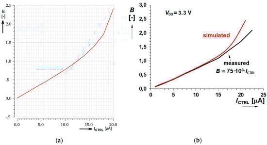 Although, strict linearity is often not necessary for the controlled amplifiers, especially in the case of automatic feedback regulation, in some sensor applications it can be beneficial, for example in amplitude modulation processing or the current multipliers. Exploiting the results from Figure 9 we could define the gain control linearity up to 10% for ICTRLmax = 12.5 µA (B = 1), as the maximum ICTRL value considered during design.
