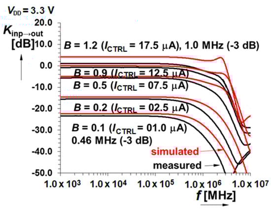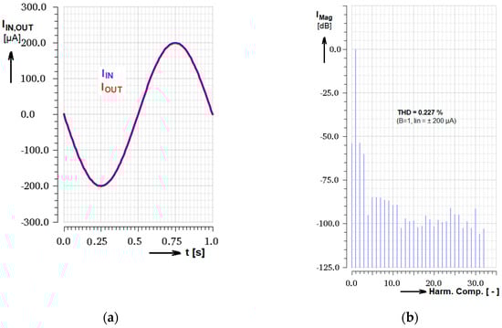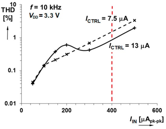 In addition to the simulation, DFT measurement was made to express the parameter in relation to the input signal amplitude for two ICTRL currents (see Figure 11). Let us note that the maximum designed and relevant peak-to-peak input range is IINmax[PK-PK] = 400 µA.