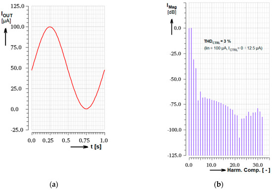 The experimental use of the control current input as the signal input was simulated and obtained results are presented in Figure 12. In this test the main input current was set to constant IIN = 100 µA and control current ICTRL was driven by the harmonic signal from 0 to 12.5 µA (with the DC pre-bias of 6.25 µA). From the transient output response, the DC shift of the output signal can be seen, as well as from the DFT results. Cadence evaluated value of THD = 3%.